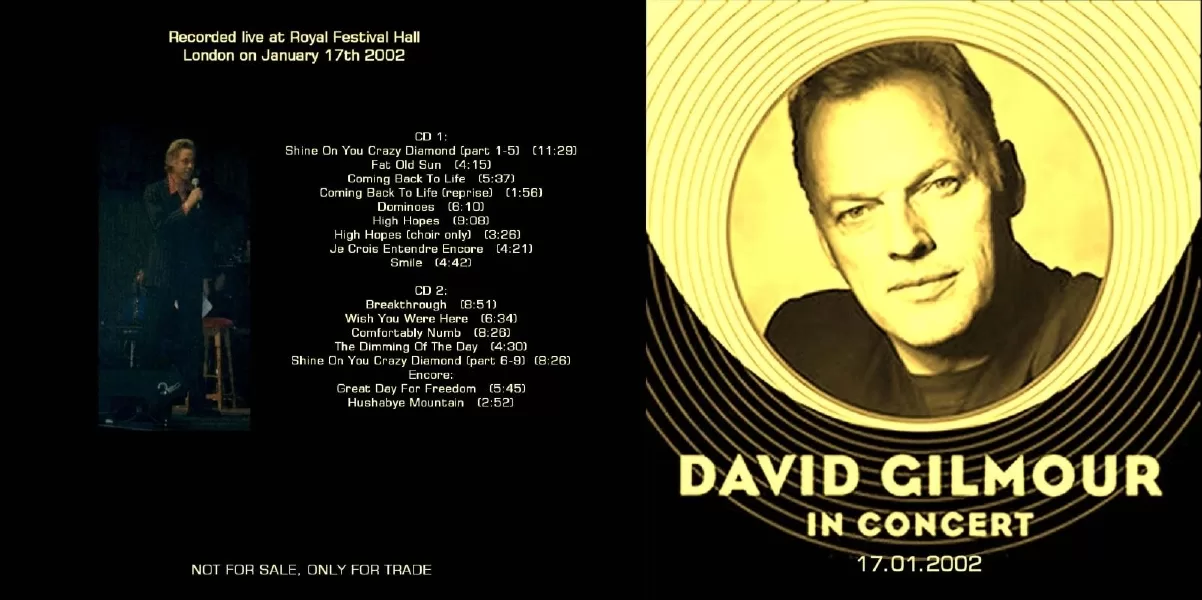 Segundo dia consecutivo de David Gilmour no “Royal Festival Hall”, em Londres, com repertório e participações idênticos ao dia anterior, exceto pela troca de Robert Wyatt (do Soft Machine) por Bob Geldof (protagonista do filme “Pink Floyd The Wall” e organizador do “Live 8”, que reuniu a formação clássica do Pink Floyd em 2005) cantando as estrofes de “Comfortably Numb”.