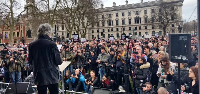 Há outros oradores aqui, por isso vou abrir caminho, eu poderia ficar aqui o dia todo protestando contra o fim da luz, se não ficarmos como bulldogs, de braços dados, fileiras cerradas na frente de nosso irmão e camarada Julian Assange. E quando os lacaios do Império Americano vierem pegá-lo, destruí-lo e pendurá-lo na cerca como um aviso para assustar futuros jornalistas, iremos olhá-los nos olhos e firmes e com uma só voz entoaremos: